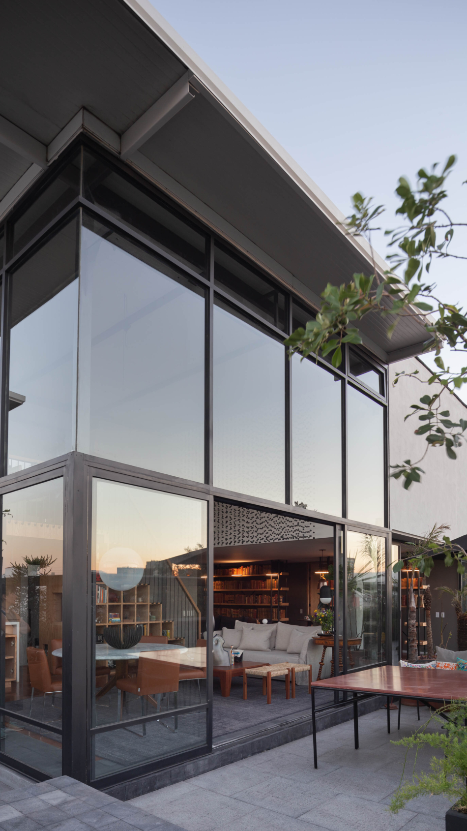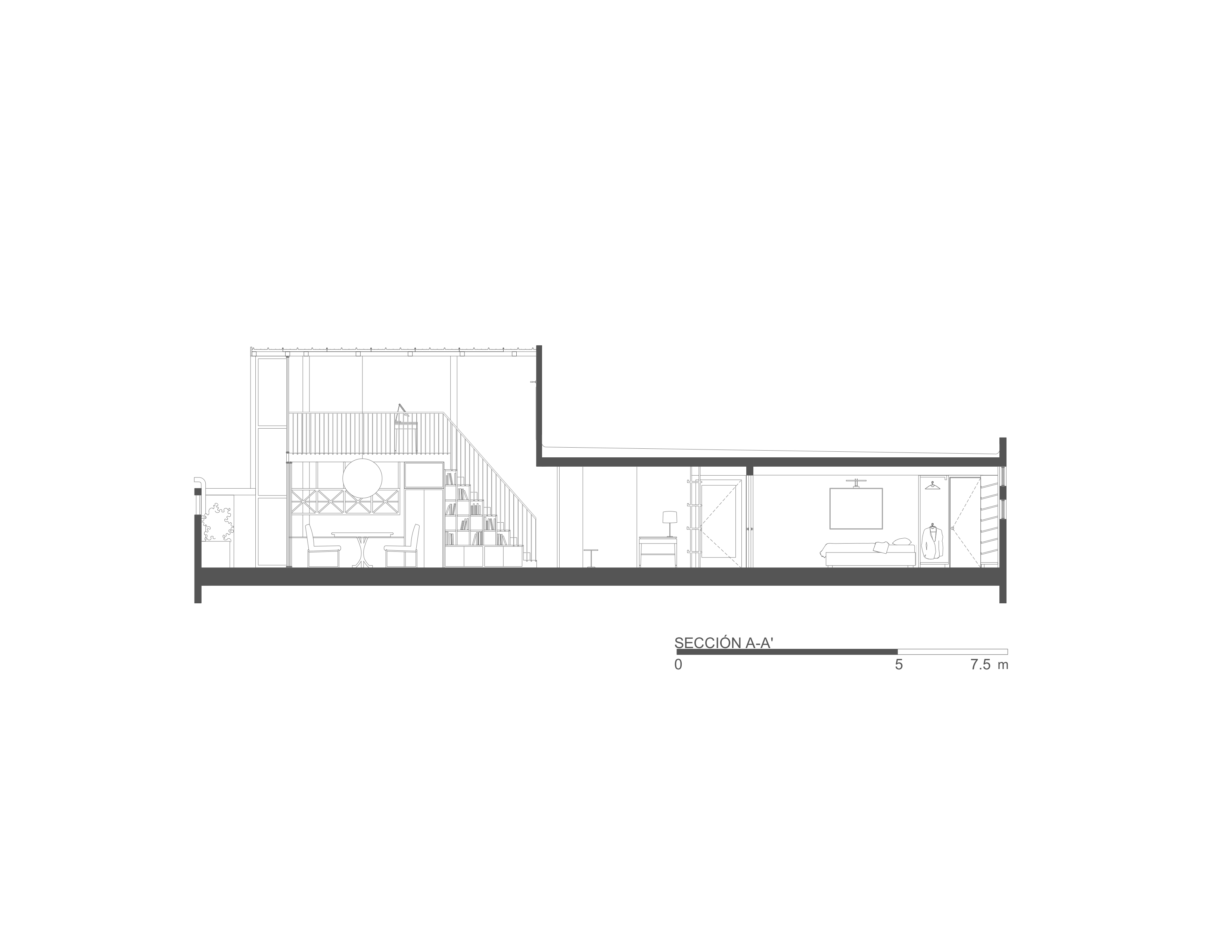 Se conservó gran parte del mobiliario y el arte de la propietaria, se diseñaron libreros para su extenso acervo, mismos que acompañan el corredor del acceso, y el escultor Adán Paredes realizó una pieza en sitio que genera juegos de sombras fascinantes. El mobiliario, la madera y el recinto dialogan con el acero y el cristal en muros y el multipanel industrial del techo, evidenciando una constante negociación del espacio y habitabilidad.