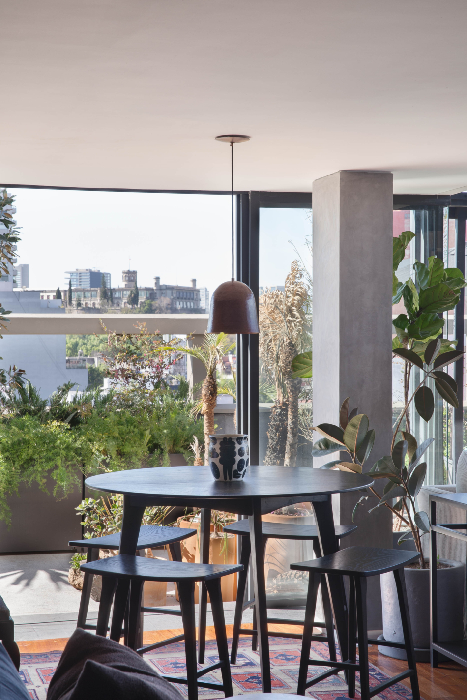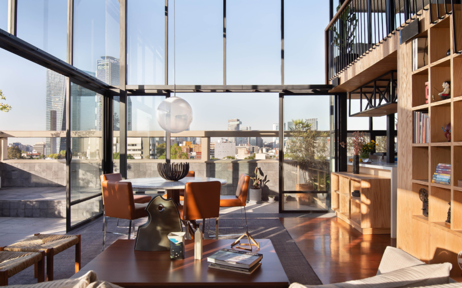 Debido a que el proyecto se realizó durante COVID-19, la ventilación cruzada, la doble altura y la terraza amplia con vista hacia Av. Reforma se convirtieron en lo más importante y por ello, el diseño de paisaje también tomó relevancia; es a través de él que se enmarca el exterior y se protege del calor. La vegetación emula la cualidad frondosa de los bosques a través de diferentes plantas, árboles y arbustos como los romeros, festucas, olivos, juníperos, ayubes, salvias y santolinas.